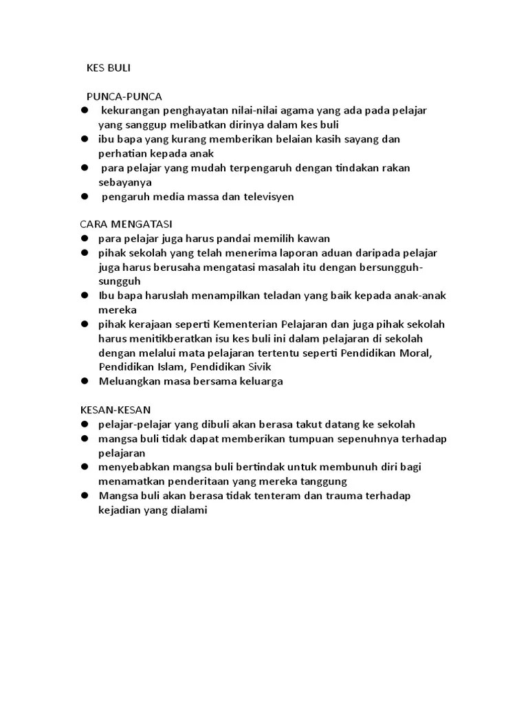 Punca Kes Buli / Gejala Buli Punca Dan Cara Mengatasi Pdf. Contoh karangan punca dan cara mengatasi budaya buli dalam kalangan pelajar sekolah. Memang tidak boleh dinafikan bahawa dewasa ini, kes buli yang berlaku di sekolah semakin berleluasa dan . Antara punca berlakunya budaya buli : Melihat angka itu sahaja pasti amat membimbangkan ibu bapa serta membuatkan ramai pelajar menjadi takut untuk ke sekolah. Media massa menyiarkan drama atau filem yang memaparkan aksi pergaduhan yang berbahaya dan ini .
